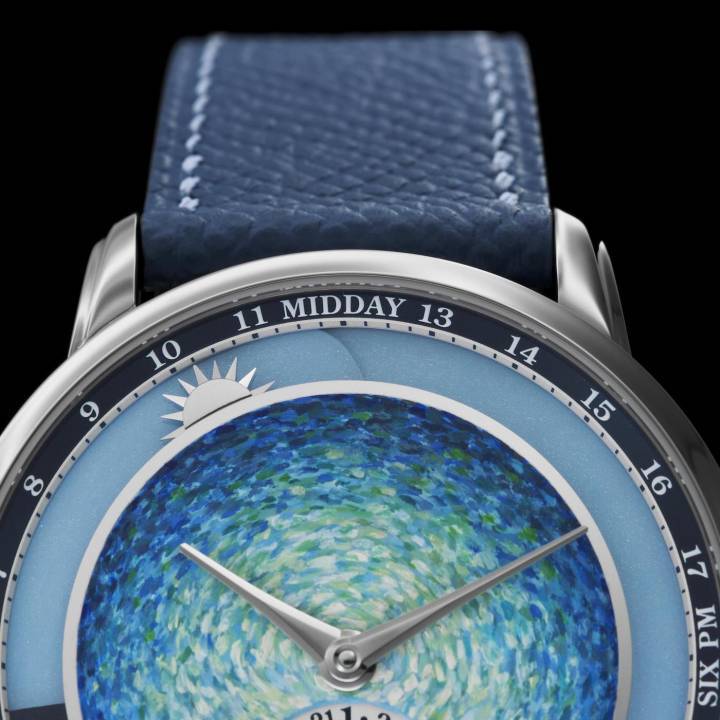 Krayon había explorado previamente la técnica de la pintura en miniatura, donde cada color se deposita a mano en pequeñas celdas ahuecadas en el metal, para crear un trabajo de increíble refinamiento para la edición 2021 de Only Watch. Esta vez, Krayon vuelve a mantener el color azul y explora la intrincada y precisa técnica del puntillismo, inspirada en la pintura de Théo van Rysselberghe.