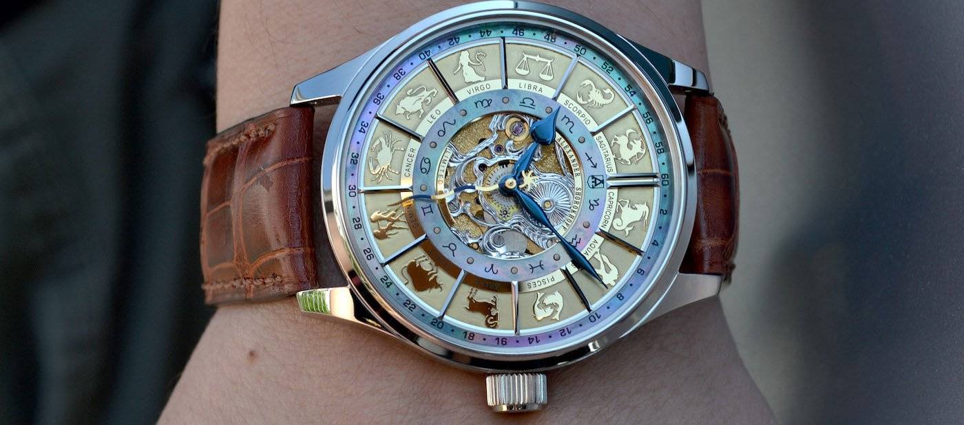La esfera consta de dos partes. La parte inferior muestra los signos del zodíaco, primero grabados al aguafuerte y luego grabados a mano. El área exterior de cada signo del zodíaco está mate a mano y chapada en oro amarillo. En la parte superior de la esfera, que consta de dos anillos de nácar y marcadores de hora, hay una pista de minutos en el anillo exterior y las abreviaturas de los signos del zodíaco en el anillo interior.