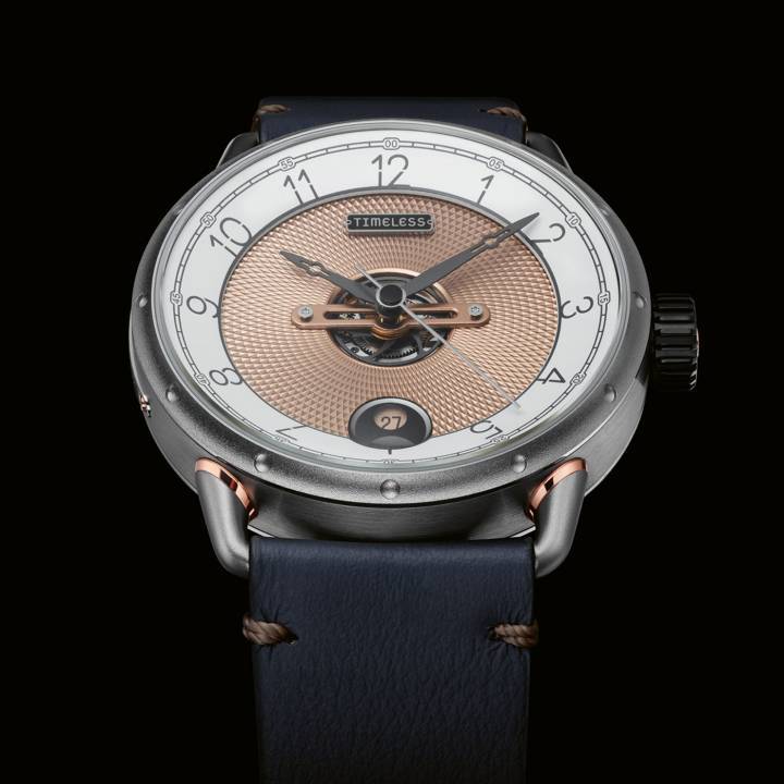 Antes de fundar Timeless, el diseñador Maël Oberkampf trabajó para algunos de los nombres más importantes de la industria relojera. Con su marca, su objetivo es ofrecer una arquitectura elegante, neovintage y accesible a todos. Naturalmente, ha elegido materiales hechos para durar: acero inoxidable, oro rosa 4N, piel de becerro y cristal de zafiro. Los acabados y la decoración combinan el guilloché tradicional y el granallado contemporáneo. El modelo HMS 003, una serie limitada de 50 piezas con un diámetro de 40,5 mm, fue preseleccionado para el Premio Challenge en el GPHG 2023. $$