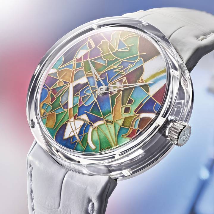 El concepto de XRby es único: crear relojes que muestren el arte y la artesanía relojera... y pongan a los artistas en el centro de atención. Después de explorar la marquetería con Rose Saneuil en 2020, la pintura en miniatura con Philippe Jacquin-Ravot en 2021 y la pintura en miniatura sobre esmalte grand feu con Gabriel Colliard en 2022, Xavier Rousset expresa la belleza del esmalte cloisonné con Matteo Stauffacher. Este modelo fue preseleccionado para el Premio Reloj de Mujer en el GPHG 2023. Estas poéticas series limitadas son un homenaje a la riqueza del arte relojero. $$$$$