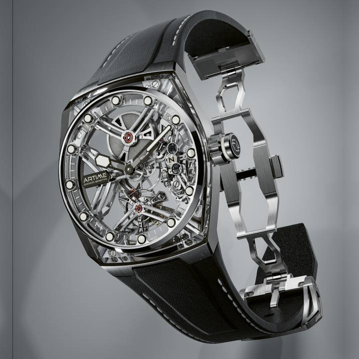 Artime es una joven marca Suiza fundada en 2021 por seis entusiastas de la relojería expertos en sus respectivos campos. El equipo formado por Fabrice Deschanel, Didier Bretin, Manuel Thomas, Claude Emmenegger, Emmanuel Jutier y Stéphane Maturel opera según el principio de gobernanza horizontal y cada uno aporta su propia experiencia al proyecto. Su reloj inaugural ART01, una serie limitada de 20 ejemplares, es un reloj excepcional con una arquitectura innovadora y contemporánea creada por el relojero Didier Bretin. La caja de 42 mm alterna entre titanio y zafiro transparente. El calibre de oro blanco, esqueletizado al extremo, presenta dos volantes y un tourbillon volante. Relojería muy aérea. $$$$$