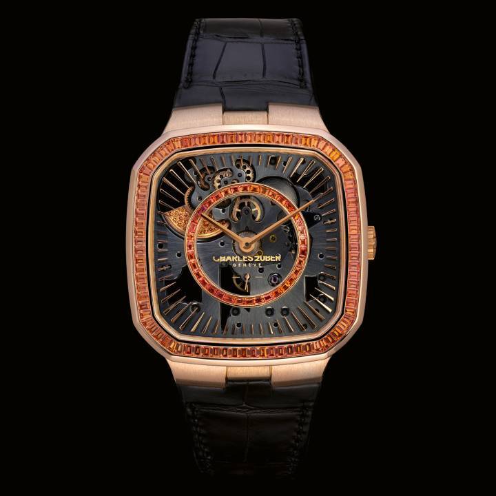 La marca Charles Zuber, con sede en Ginebra y que lleva el nombre de un histórico diseñador de relojes Suizo, hizo su debut en 2022 con su primera creación: el Perfos, un reloj con forma diseñado por Eric Giroud. Este año, la marca presentó el opulento Perfos Karl, engastado con 84 zafiros de talla baguette de color naranja azafrán con un total de 2,42 quilates. El modelo está esqueletizado íntegramente a mano por Cédric Johner, uno de los últimos relojeros de Ginebra que practicó su arte de forma tradicional. Un diseño decididamente contemporáneo. $$$$$