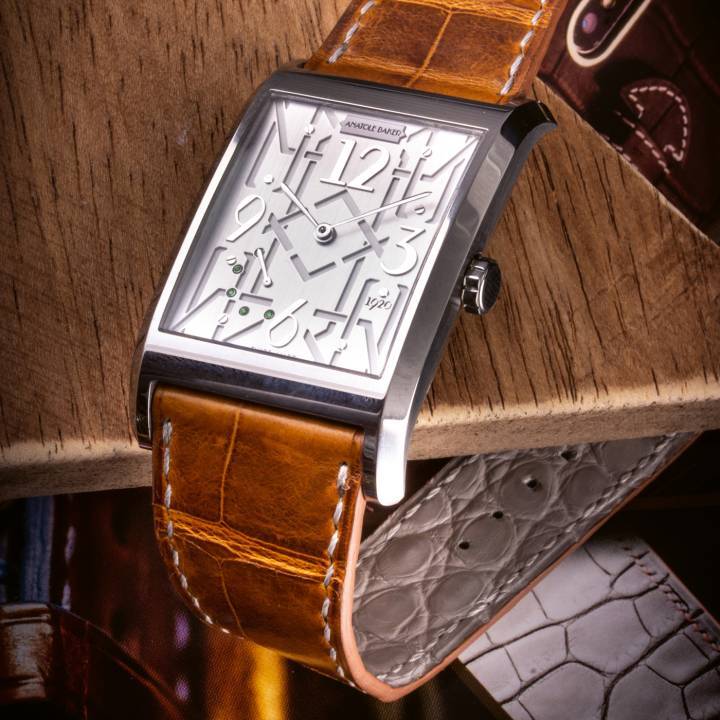 Yann Perrin, propietario del conocido especialista en marroquinería Atelier du Bracelet Parisien, también está detrás de la marca Anatole Baker, con su estilo decididamente Art Déco de los locos años veinte que iluminó la Ciudad de la Luz hace un siglo. Si bien la inspiración es parisina, los relojes se ensamblan en Ginebra, con un movimiento Suizo. Y, por supuesto, están equipados con una correa especial, hecha a medida para cada reloj vendido. Un reloj rectangular especialmente agradable de llevar. $$$