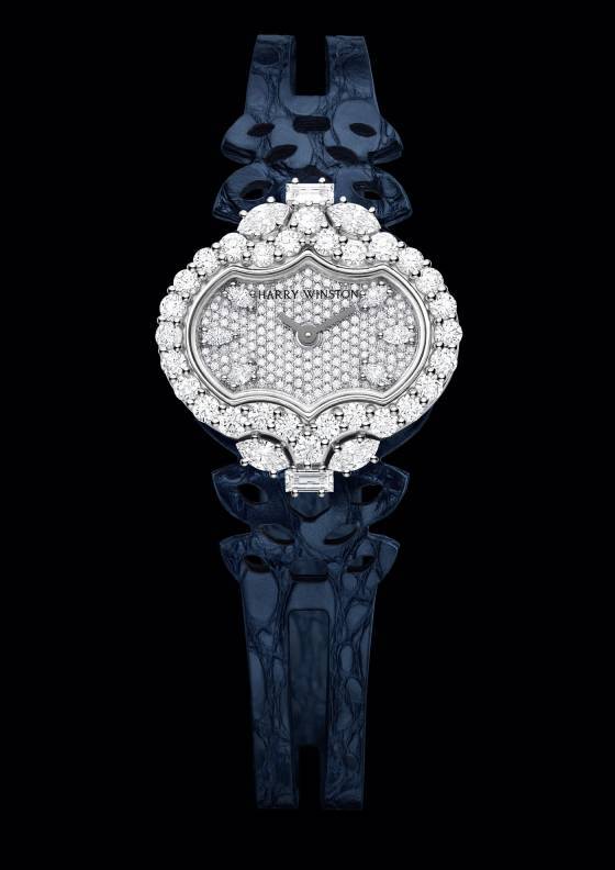 El Divine Time de Harry Winston se puede llevar en la muñeca o como colgante. Se han utilizado seis diamantes talla marquesa como índices en una esfera pavimentada con diamantes. El fuego de las piedras está en su mejor momento. La elegante correa de piel de cocodrilo azul medianoche es una refinada adición.