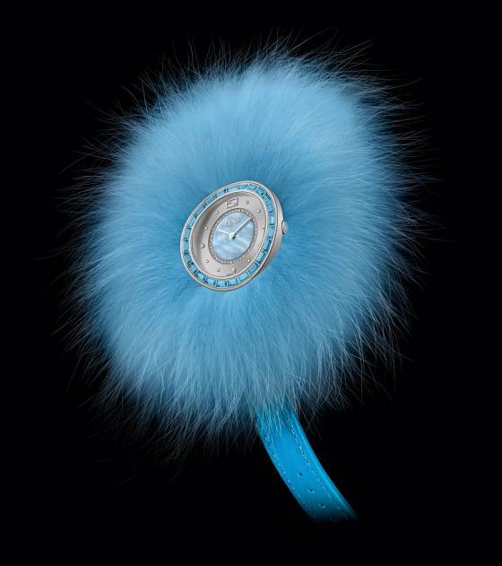 Tome una caja redonda de acero inoxidable de 36 mm, coloque el bisel con 24 topacios azules cortados en arco, inserte una esfera exterior gris con patrón de rayos solares con una esfera interior redonda de nácar azul central rodeada de un anillo de diamantes, tachuelas de plata aplicadas y tres índices de diamante, agregue agujas de las horas y los minutos de color plateado, coloque una correa de piel de becerro azul Dolce T. y asegúrese de que el reloj funcione con un movimiento de cuarzo de fabricación Suiza. El resultado es un elegante reloj Fendi que se puede usar en cualquier lugar y en cualquier momento. Sin embargo, si quiere hacer una declaración de su intención, muéstreles a los amantes de la moda el último adorno de moda en la muñeca, simplemente coloque una Dorothy Glamy azul hecha de piel de zorro ártico al reloj y listo, está usando un espectacular ramillete modernizado. My Way Topazes Special Edition de Fendi está disponible con topacios azules o verdes, correa de cuero a juego y una llamativa Dorothy Glamy.