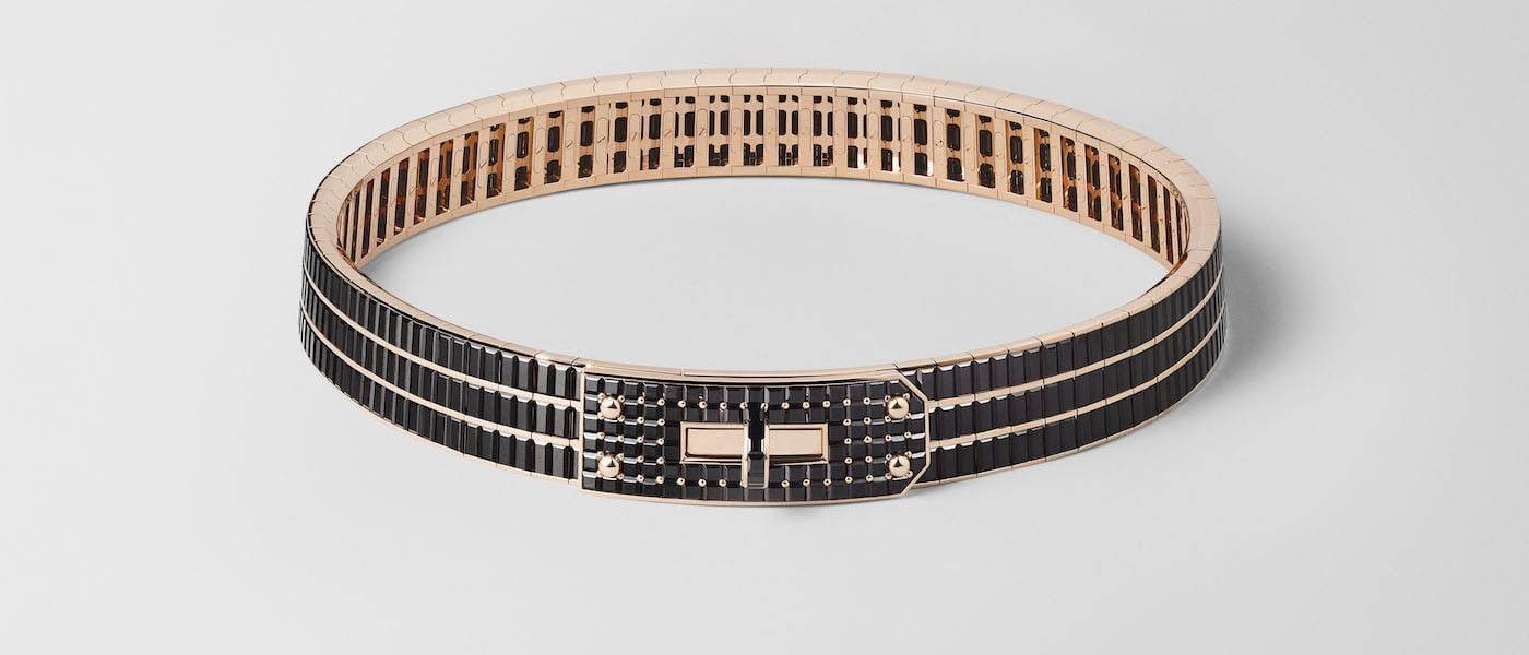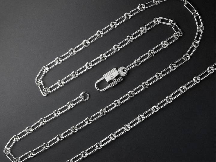 El codiciado bolso se presta entonces al oro rosa, también reciclado, y se convierte en el Kelly Chaîne. El broche de un collar de corbata brilla con diamantes discretos; un solo brazalete está pavimentado con 368 diamantes, mientras que un brazalete doble está adornado con 41 diamantes en su cierre; hay una delicada gargantilla e incluso joyas para el cuerpo que caen en cascada desde la garganta hasta las caderas. Una cadena liberadora.