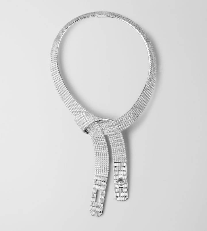 La colección se vuelve aún más encantadora cuando Kelly Gavroche revela su encanto. El prolífico director creativo rinde homenaje al pañuelo ’Gavroche’ que se lleva enrollado y anudado alrededor del cuello. Ahora un collar, dos íconos se convierten en un objeto maravilloso. Completamente pavimentado con diamantes, la correa lateral se abrocha con toda la delicadeza de la seda. Un total de 1.771 diamantes baguette y redondos (74,32 quilates), todos clasificados F por su claridad, adornan lo que es una pieza destacada dentro de la colección.