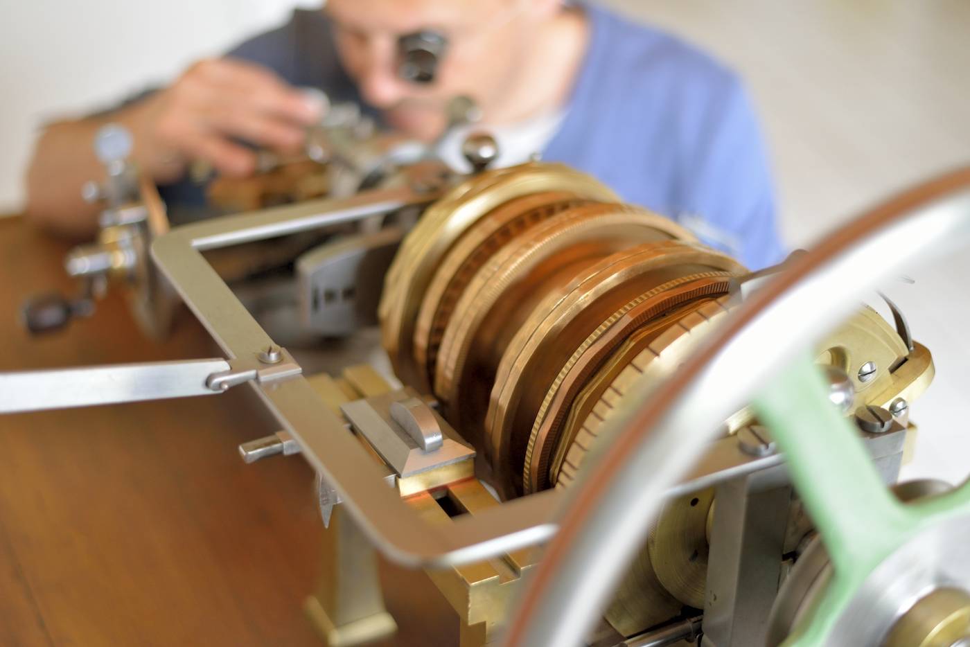 Con la mano izquierda, el cortador hace girar un mango que, lentamente, mediante una correa, acciona el husillo. Con la mano derecha acerca un buril, fijado a un carro, a la esfera que quiere grabar. Una vez grabada una línea circular, el cortador desplaza ligeramente el buril y repite la operación. «Algunos patrones requieren mil líneas», dice Yann von Kaenel. “Hay que mantenerse concentrado desde el principio hasta el último. ¡No puedes dejar que tu atención divague!