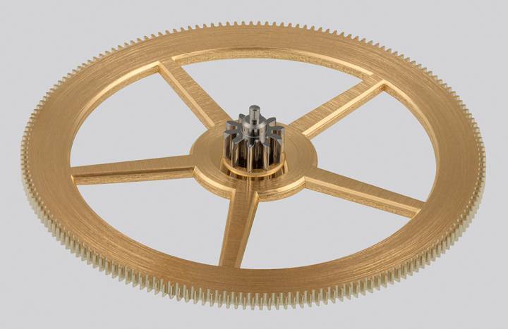 - Experto en la producción de trenes de relojería, Dubois Dépraz ofrece ahora ruedas biseladas pulidas con graneado circular con molduras circulares, o piñones con alas pulidas, cuyas características cumplen con los más altos estándares, como el Sello de Ginebra.