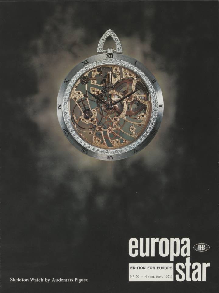 - Los años setenta marcaron el comienzo de la transición de la relojería Suiza hacia una consolidación de los jugadores en el lugar bajo el efecto de la competencia extranjera. Esta portada de Europa Star muestra una creación de Audemars Piguet, solo unos años antes de la aparición del Royal Oak, el sorprendente símbolo de los años Setenta.