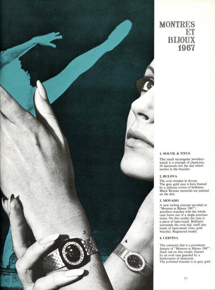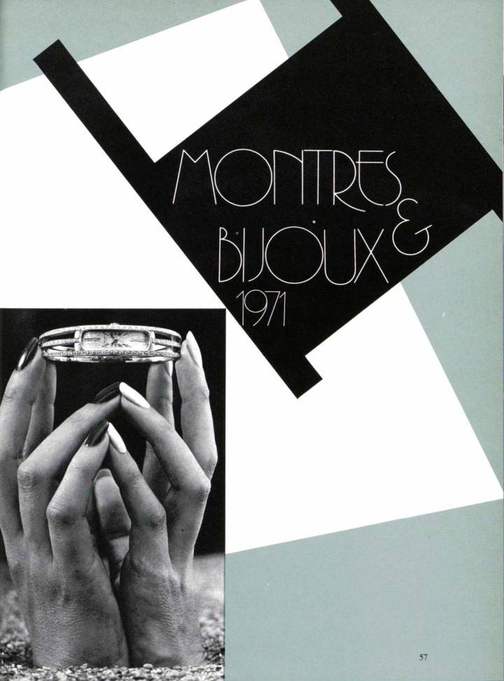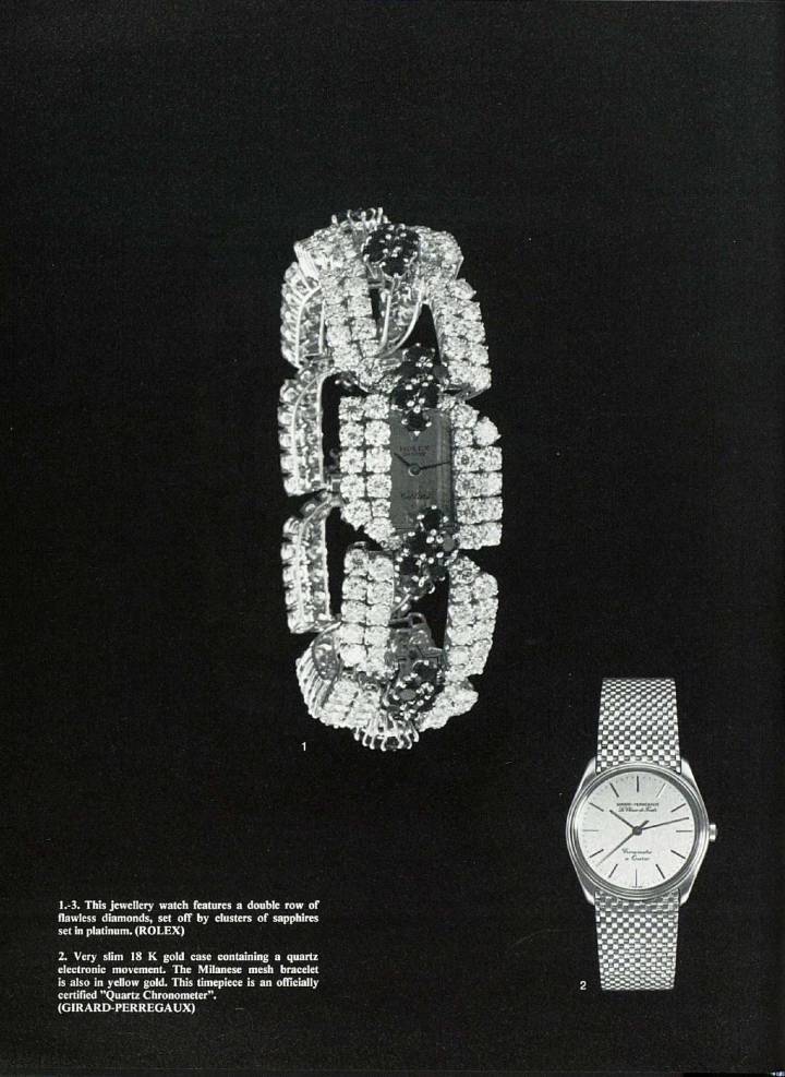 - En la década de 1970, los relojes de cuarzo llegaron a la feria de Montres et Bijoux. Este modelo de Girard-Perregaux se ve muy discreto en la página junto con el reloj de joyería presentado por Rolex.