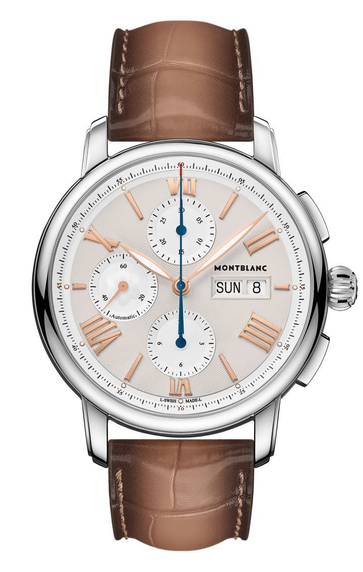 - El nuevo Montblanc Star Legacy Chronograph Day & Date está alojado en una caja de acero inoxidable de 43 mm con un cristal de zafiro abovedado en la parte delantera y un cristal de zafiro en la parte posterior, lo que permite al usuario la posibilidad de admirar el movimiento del cronógrafo automático MB25.07 debajo. El movimiento del cronógrafo MB25.07 tiene una reserva de marcha de 48 horas e indica los segundos transcurridos a través de un segundero central del cronógrafo, los minutos transcurridos en un contador de 30 minutos y las horas transcurridas en un contador de 12 horas. El día y la fecha se muestran en aperturas a las tres en punto.