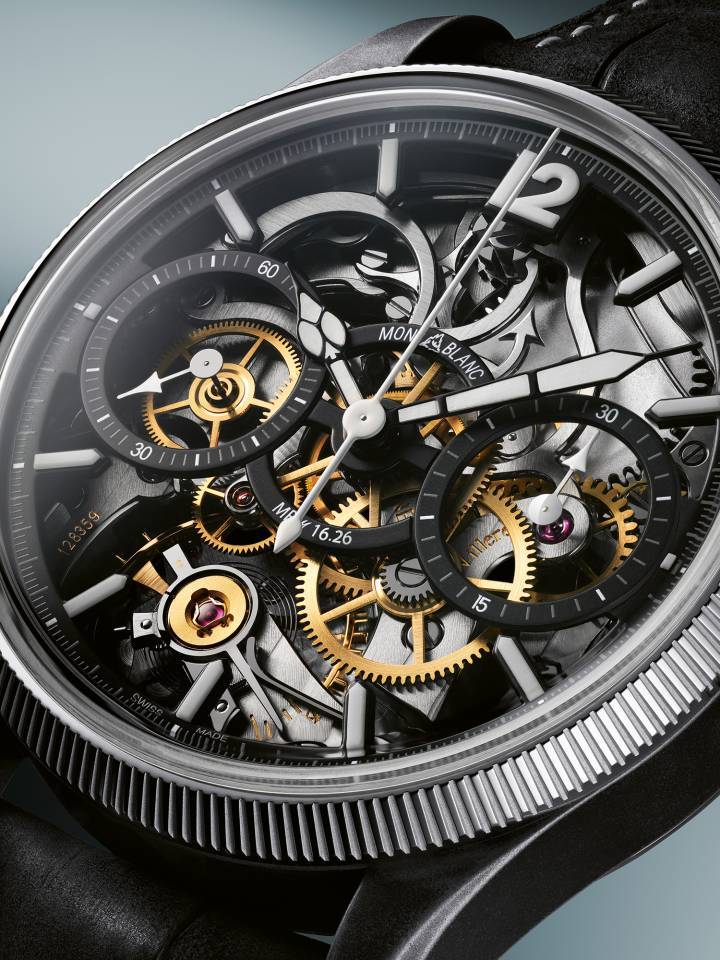 Otra faceta importante de la relojería de Montblanc es la integración de la manufactura Minerva, “una fuente infinita de historias e inspiración”. El año pasado produjo el cronógrafo Secret Minerva Monopusher de Montblanc, Secret Minerva. Contrariamente a las apariencias, este no es un movimiento esqueleto. En otro de los trucos favoritos de «lado/trasero» de Lecamp, el movimiento de herida manual, construido sobre el calibre de cronógrafo Minerva MB 16.29 monopusher, se ha volteado para mostrar la mecánica en el lado de la esfera. Invertir un movimiento puede parecer algo fácil de hacer; En realidad, es una operación compleja ya que las manos deben montarse en lo que normalmente sería la parte posterior y su rotación se invierte.